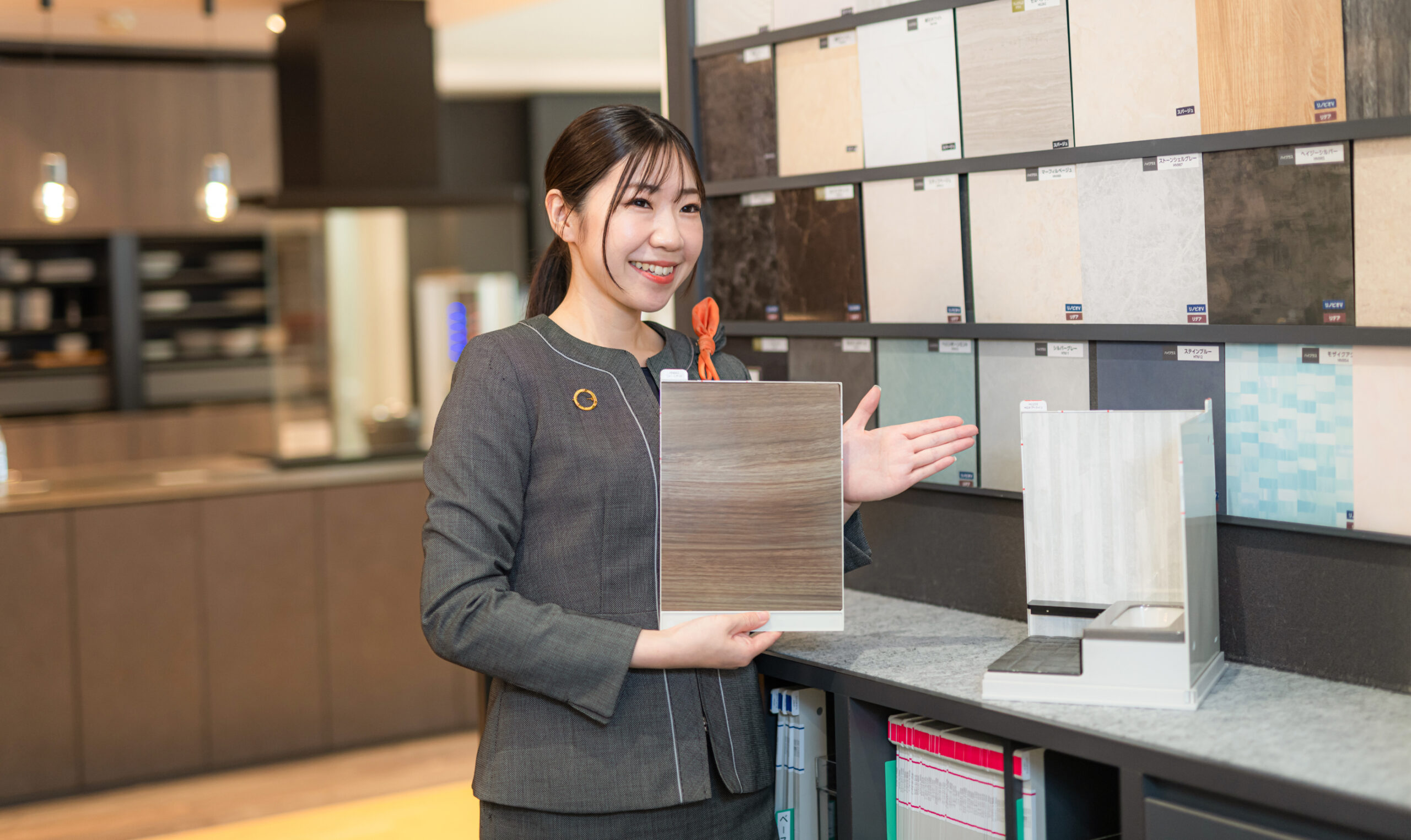 前職では冠婚葬祭の会社で事務職をしていましたが、姉が建築関係の仕事に就いていたことや、実家のリフォームでショールームを訪れた経験から、接客業、特に暮らしに関わる仕事に興味を持つようになりました。